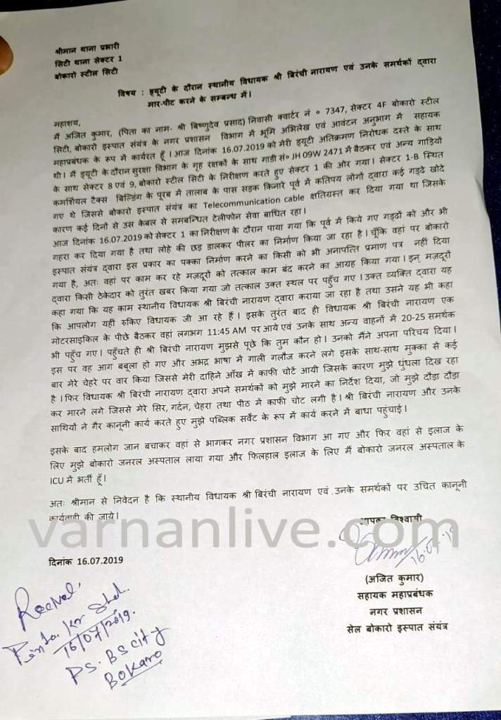 उसने स्थानीय विधायक बिरंची नारायण द्वारा यह कार्य कराए जाने की बात कही और उसकी सूचना के बाद विधायक भी मोटरसाइकिल के पीछे बैठकर लगभग 11.45 बजे पहुंचे। साथ में उनके समर्थक भी आए। एजीएम के अनुसार पहुंचते ही बिरंची ने उनसे पूछा- तुम कौन हो? उन्होंने जब अपना परिचय दिया तो इस पर वह आग-बबूला हो गए। उसके बाद गाली-गलौज और मारपीट की। इस घटना के बाद वे लोग जान बचाकर वहां से भागकर नगर प्रशासन विभाग आ गये। वहां से इलाज के लिए उन्हें बोकारो जनरल अस्पताल लाया गया और फिलहाल अस्पताल के आईसीयू में उनका इलाज चल रहा है।
