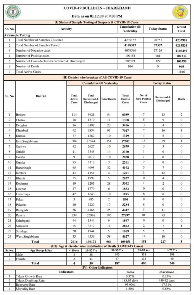 झारखण्ड में मंगलवार को जारी रिपोर्ट के अनुसार 181 कोरोना पॉजिटिव मरीजों की पुष्टि हुई, जिनमें रांची से 81, बोकारो से 7, चतरा से 5, देवघर से 3, धनबाद से 7, दुमका से 4, पूर्वी सिंहभूम से 18, गढ़वा से 3, गिरीडीह से 1, गोड्डा से 1, गुमला से 2, हजारीबाग से 5, जामताड़ा से 3, कोडरमा से 1, लोहरदगा से 8, पलामू से 8, रामगढ़ से 3, सरायकेला से 2, सिमडेगा से 5, पश्चिमी सिंहभूम से 14 रहे। राज्य में कुल पॉजिटिव मामलों का आंकड़ा 109332 पर पहुंच गया है। मंगलवार को सूबे में कुल पांच मौतें हुईं।