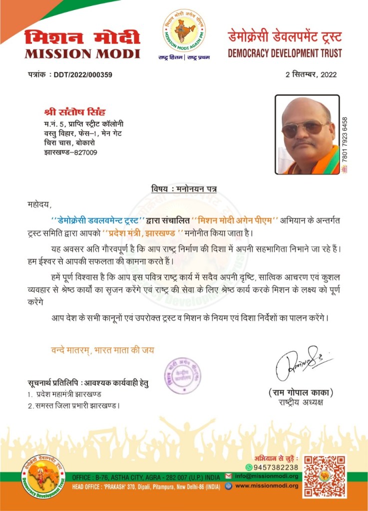 बोकारो। ‘मिशन मोदी’ की टीम फिर 2024 में नरेन्द्र मोदी को प्रधानमंत्री बनाने के लिए तैयार हो गई है। पिछले लोकसभा चुनाव में भी मिशन मोदी ने देश के कोने कोने में अपनी टीम गठित कर मोदी को प्रधानमंत्री बनाने के लिए बहुत मेहनत की थी और उसका नतीजा सामने है। अब फिर 2024 में मोदी को प्रधानमंत्री बनाने के लिए ‘मिशन मोदी’ की टीम ने कमर कस ली है। इस बार डेमोक्रेसी डेवलपमेंट ट्रस्ट के तहत राम गोपाल काका, राष्ट्रीय अध्यक्ष के कंधों पर यह जिम्मेदारी है। झारखंड में इस मिशन को सफलीभूत करने के लिए उन्होंने एक सभा में बोकारो के संतोष सिंह को ‘मिशन मोदी अगेन’ का झारखंड प्रदेश मंत्री बनाकर उन्हें इस राज्य की जिम्मेदारी दी है । गौरतलब है कि संतोष सिंह पहले भी बोकारो जिला अध्यक्ष के रूप में काफी सक्रियता के साथ अच्छा काम कर चुके हैं। मिशन मोदी को उन्होंने बोकारो में एक खास पहचान दिलाई है। प्रदेश मंत्री बनाए जाने पर संतोष ने अपने उच्चतर पदधारियों के प्रति आभार व्यक्त किया। उन्होंने कहा कि वर्ष 2024 में मिशन मोदी एक बार फिर कामयाब होगा और भारत विश्वपटल पर एक नए स्वरूप में, नए तेवर में नजर आएगा।