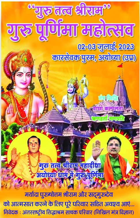 कार्यक्रम के मीडिया प्रभारी विजय कुमार झा ने उक्त जानकारी देते हुए बताया कि परमहंस स्वामी निखिलेश्वरानंद जी (डॉ. नारायण दत्त श्रीमाली) एवं माता भगवती की दिव्य छत्रछाया तथा पूज्य गुरुदेव श्री नंदकिशोर श्रीमाली जी के सानिध्य में मर्यादा पुरुषोत्तम भगवान श्रीराम की इस पावन भूमि पर आयोजित इस दो-दिवसीय गुरु पूर्णिमा महोत्सव में देश-विदेश से हजारों की संख्या में निखिल शिष्यों का समागम होगा। इस दौरान गुरुदेव श्री श्रीमाली साधकों को गुरु-दीक्षा के साथ-साथ गुरु तत्व श्रीराम तथा मानव जीवन के जीवन के लिए उपयोगी अन्य प्रकार की शक्तिपात दीक्षाएं प्रदान करेंगे।